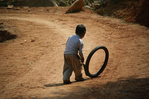 Prakash, a kid in the neighborhood, spends hours by himself, playing with the same rubber tube, sometimes rolling and running with it, sometimes tying cotton thread all around it, and sometimes to just throw it at the barking dog, unsuccessfully though because his hands are still tiny.